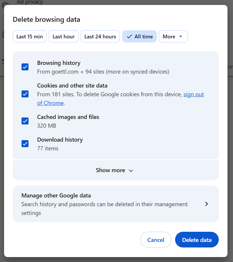 - Make sure your screen matches with the screenshot below (including having the same 4 boxes checked), and click Delete data