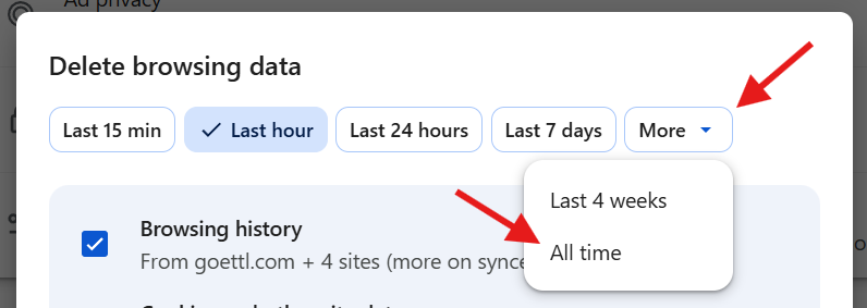 - Ensure you have the Time range set to "All time", the 4 boxes checked as show in the screenshot below, and click Clear now