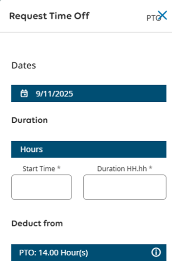Then select the date(s) you want to request off and click apply. You will then enter the time you normally begin work and select the number of hours per day you are requesting off. Once this is completed, click submit. Please remember if you are requesting multiple days on the same request, only enter 8 hours in reference to how many hours per day off.