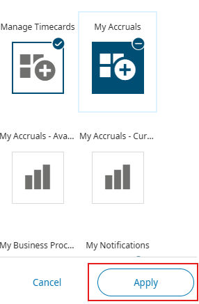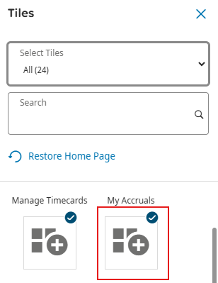 You will see a pop up window appear on the right side of the screen. Locate the "My Accruals" icon and click on it. You should see a check box appear in the top right corner of the icon to make it active.