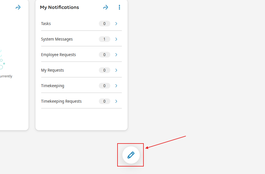 If you don't see the "My Accruals" card, you will need to add it to your dashboard. To add it, scroll down to the bottom of your dashboard and locate the edit icon (pencil icon). Click on the icon.