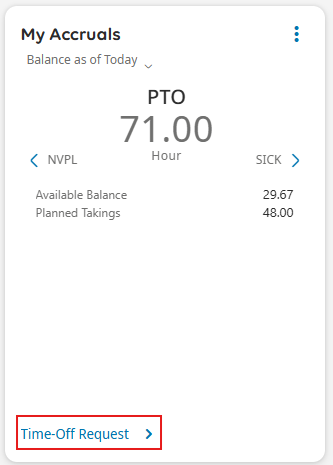 On your Home Screen, select Time-Off Request. This is located at the bottom of the "My Accruals" card.