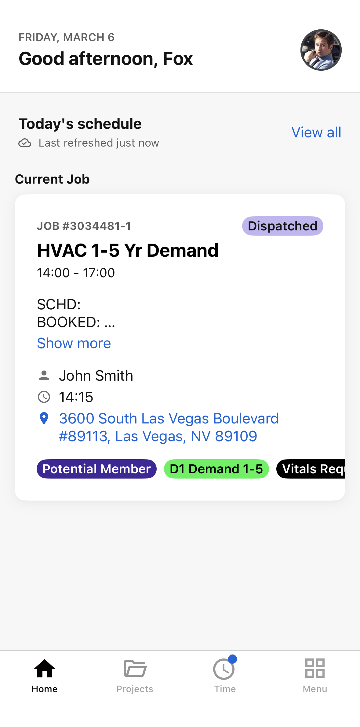 Next, you'll be greeted to the new home screen! At the top, under Today's schedule, you'll note how this new app updates constantly in real time. Below that are any upcoming appointments or jobs. And at the very bottom, you'll see additional areas where you can access any projects under Projects, access timecards or clock in and out within Time, or change any account or device settings (including clearing app cache) within Menu.